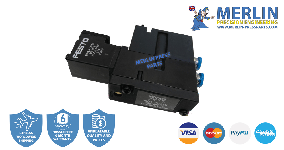 M2.184.1111 Heidelberg / Festo Solenoid 4/2 Way Valve (Festo Original). We stock a wide range of pneumatic parts for Heidelberg printing presses. If you are looking for high-quality or original Heidelberg printing machine parts then look no further than Merlin Press Parts. We offer industry-leading warranties and guarantees. We ship our spares for Heidelberg presses to everywhere in the world, offering express worldwide delivery with same-day-dispatch when ordered before 1 pm UK (If in stock).