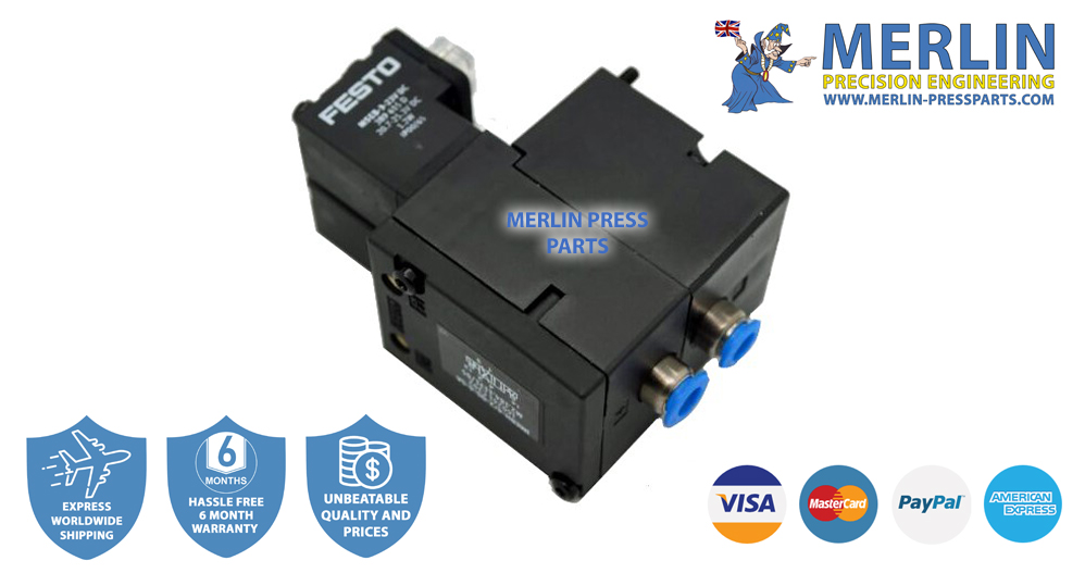 M2.184.1131 Heidelberg / Festo Solenoid Valve Unit 6mm 23V. We stock a wide range of pneumatic parts for Heidelberg printing presses. If you are looking for high-quality or original Heidelberg printing machine parts then look no further than Merlin Press Parts. We offer industry-leading warranties and guarantees. We ship our spares for Heidelberg presses to everywhere in the world, offering express worldwide delivery with same-day-dispatch when ordered before 1 pm UK (If in stock).