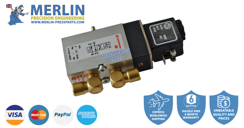 S9.184.1051 Heidelberg 4/2 Way Solenoid Valve. We stock a wide range of pneumatic parts for Heidelberg printing presses. If you are looking for high-quality or original Heidelberg printing machine parts then look no further than Merlin Press Parts. We offer industry-leading warranties and guarantees. We ship our spares for Heidelberg presses to everywhere in the world, offering express worldwide delivery with same-day-dispatch when ordered before 1 pm UK (If in stock).